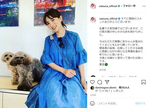 タレントの夏菜さんが9月23日、愛犬たちとの写真とともに第1子の妊娠をInstagramで報告。夏菜さんは同月14日に所属事務所を通じて妊娠を発表していました。