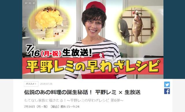 それ以外にも事前に決められた分量や順番は気にせず、豪快気ままに料理するスタイルの平野。アナウンサーが「予測不能のレミさんの生放送なので、事前に準備したものと違う可能性があります」と説明。澤部のほか、ゲスト出演した女優、大竹しのぶやタレントの中山秀征が試食する際には「試食品は衛生管理が徹底された調理室で調理しています」と注釈が出た。