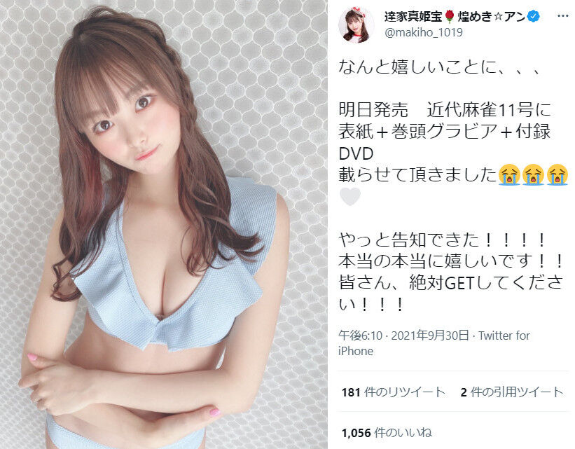 元AKB48で現在はアイドルグループ「煌めき☆アンフォレント」のセンターとして活躍する達家真姫宝(たつや・まきほ=19歳)が、2021年10月1日発売の雑誌「近代麻雀」で、表紙+巻頭グラビア+付録DVDを飾りました。