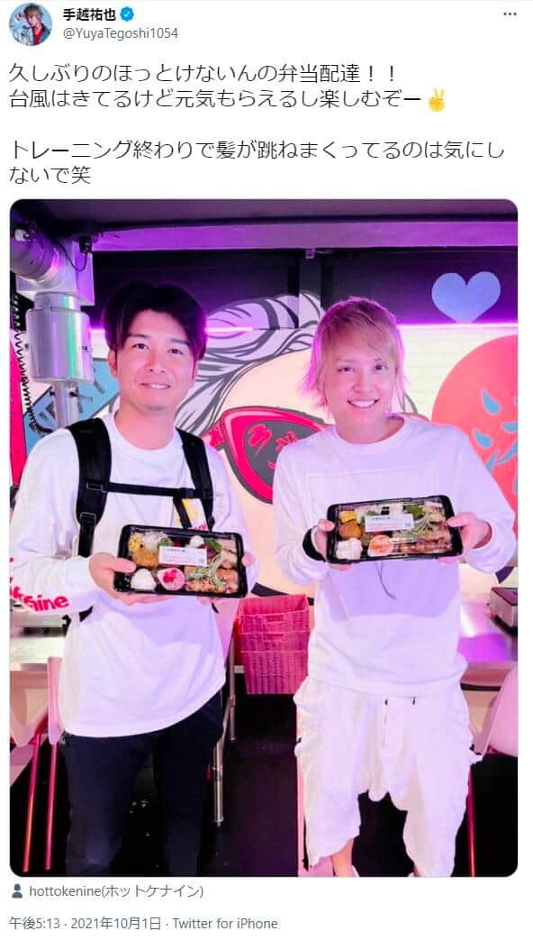 手越さんは2020年6月ごろから、hottokenineの前身となった食糧支援プロジェクト「INGプロジェクト2020」に参加し自転車で弁当の配達を行っている。