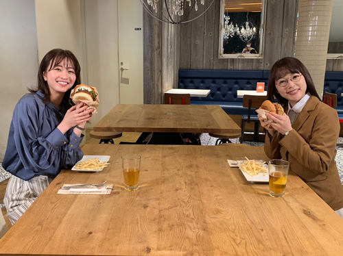 一方、岡崎は一番美味しそうな角度でハンバーガーをカメラに向けている。爽やかな笑みとアングル最高のハンバーガーの組み合わせに健康的な美しさを感じる。この写真は『BSテレ東「ごほうびごはん」』のオフショットで、主人公・咲子を演じる桜井と、同期・かえでを演じる岡崎が、それぞれが写っている。
