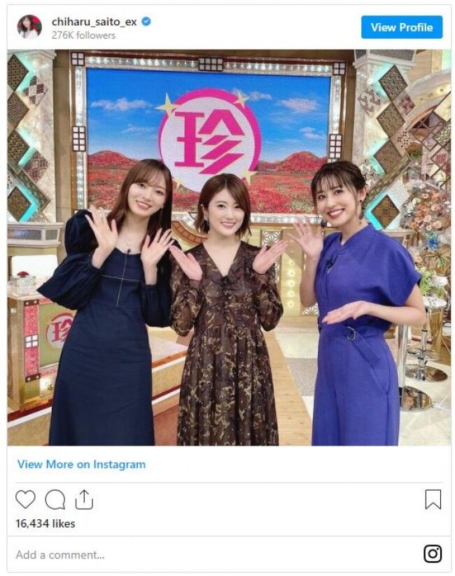斎藤は「木坂46の樋口日奈ちゃんと梅澤美波ちゃんがナニコレ珍百景に出演です ちまとは同じ一期生で色んな苦楽を共にしてきた仲間なので…本当に感慨深かった うめちゃんはなんとナニコレ珍百景で2回目の共演…!嬉しかったな~」と綴っている。ちまとは、樋口日奈のニックネームだ。