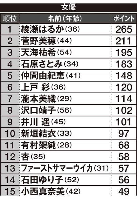 今回は、女優編。1位は綾瀬はるか。「下っ端にも気軽に話しかけてくれ、現場を和ませてくれた」「ロケに使う重い機材を一緒に運んでくれた」など、現場人気は絶大。とにかく明るい話しか聞こえてこない。
