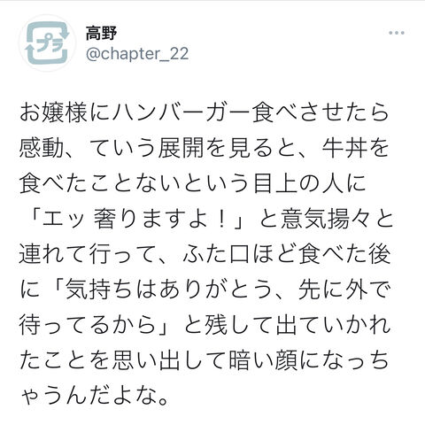 お嬢様にハンバーガー食べさせたら感動、ていう展開を見ると、牛丼を食べたことないという目上の人に「エッ 奢りますよ!」と意気揚々と連れて行って、ふた口ほど食べた後に「気持ちはありがとう、先に外で待ってるから」と残して出ていかれたことを思い出して暗い顔になっちゃうんだよな。