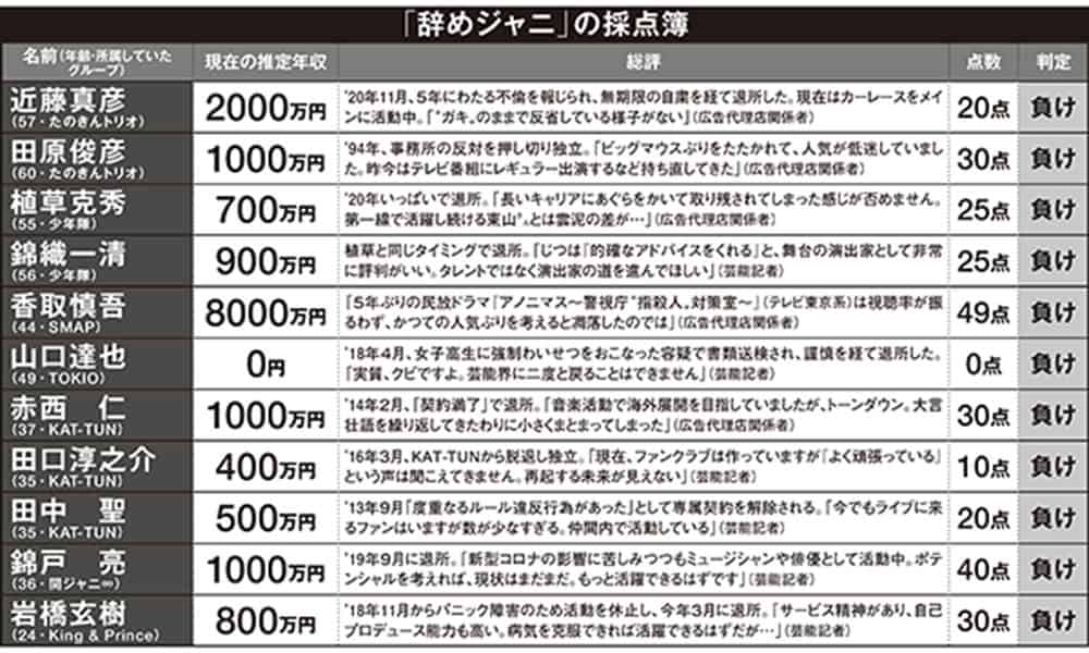 そこで本誌は、大手広告代理店のジャニーズ担当者から極秘メモを入手。「辞めジャニ」たちのの現在の推定年収と、独立後の活躍ぶりを採点し、“負け組” になった11人をまとめた。