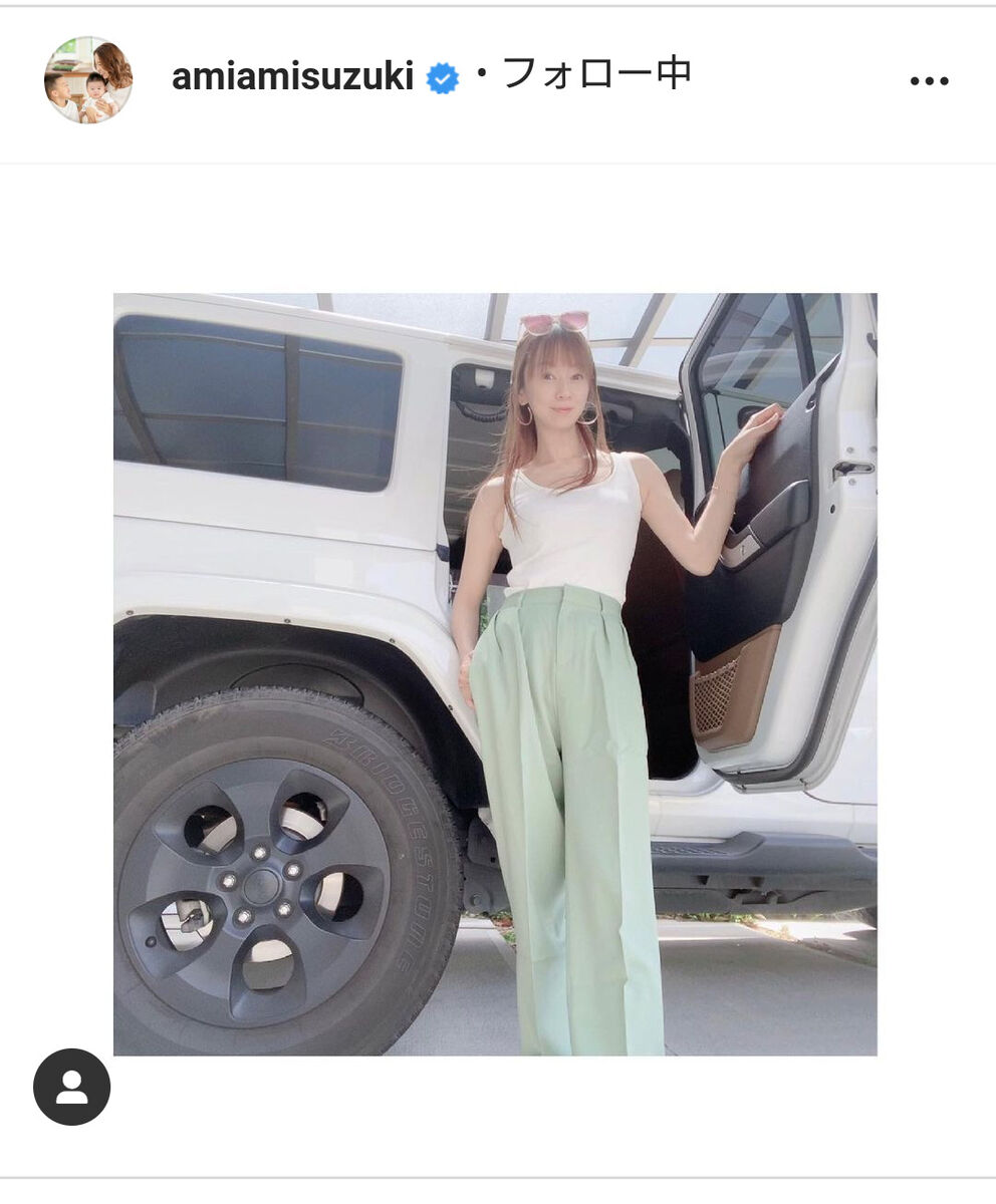 歌手でタレントの鈴木亜美(39)が21日、自身のインスタグラムを更新し、愛車・ジープとの2ショットを披露した。
