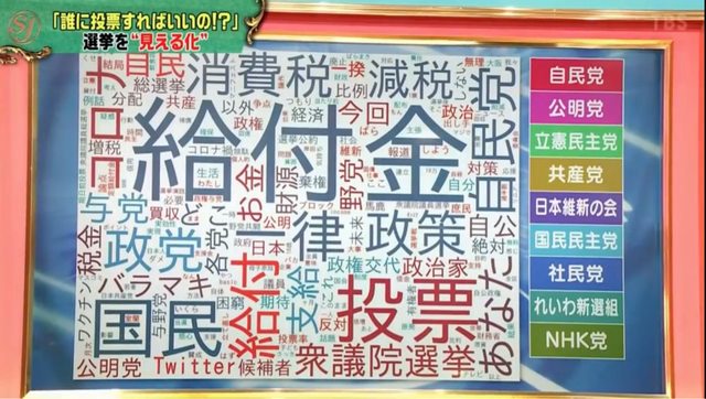 選挙に向けて、候補者の公約や有権者の意識などが「見える化」され、わかりやすくなっていることを紹介。世相を表すキーワードが、大小サイズでびっしりとスタジオの大きなモニターに映し出された。