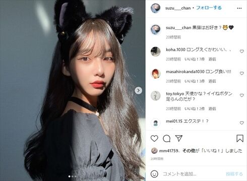 「黒猫はお好き?」と問いかけながら、黒髪ロングのウィッグに猫耳をつけた黒猫コスプレをアップした山之内さん。ショートヘアのボーイッシュなイメージが一変する大人びた姿を披露しており、ファンからは「印象ガラリと変わりますね。素敵です」「すずちゃんのロング尊い」「これすずちゃん!? セクシーさもあってかわいい!」など新たな魅力を絶賛するコメントが多く寄せられました。ロングヘアという隠し玉を持っていた……!