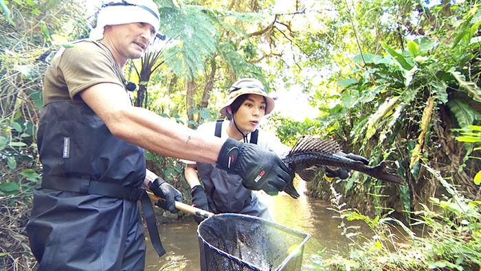 外来種駆除のため沖縄県を訪れた城島茂と松岡。コーナーレギュラーの加藤英明氏は「7月に沖縄が世界自然遺産に登録されたんですよ。でも、ピンチなんです」と話す。