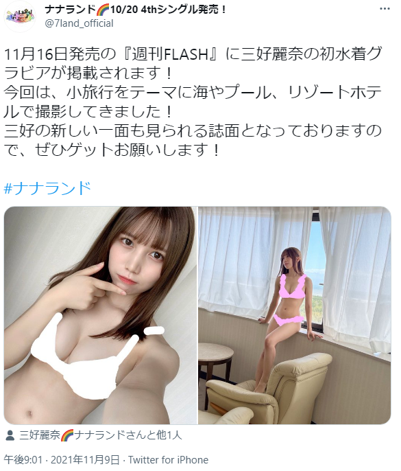 アイドルグループ「ナナランド」のメンバー・三好麗奈(22歳=フィリピンハーフ)が、2021年11月17日発売の雑誌「週刊FLASH」で、初水着グラビアを披露することがわかりました。