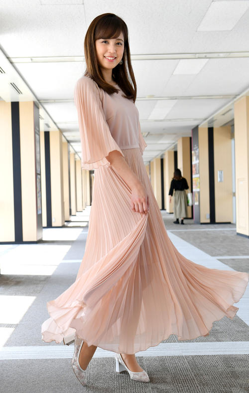 久慈は、ミントグリーンのワンピース姿だ。甘いフェイスと優しい眼差しで人気のある久慈だが、淡い色のコーディネイトは、彼女の持つピュアのイメージにぴったりだ。