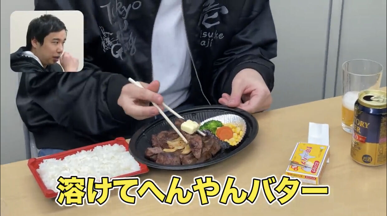 …と、その前に取り出したのがバター。「バターをね、これ毎回ね」と粗品。個包装になったバターを1個まるごとステーキの肉片に乗せ、そのまま口へ運ぶ。