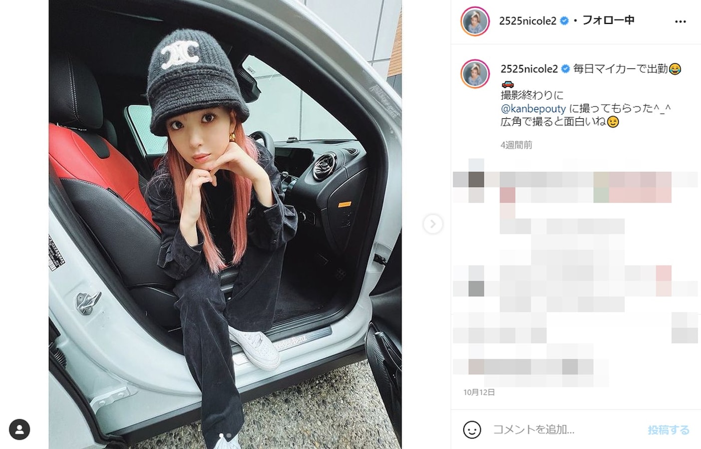 モデルの藤田ニコルさんは、11月15日に自身のInstagramを更新。バラエティ番組で挑戦したドリフト駐車の動画を投稿しました。