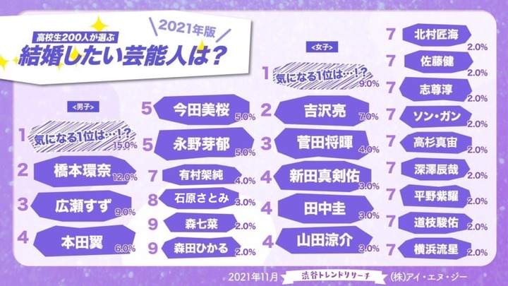 11月22日は「いい夫婦の日」。高校生向け広告・マーケティングを行うアイ・エヌ・ジーは、高校生男女200名に『理想の夫婦と結婚観に関する調査』を実施し、ランキングを発表しました。今回は、その中から「男子高校生が選ぶ『結婚したい芸能人』」ランキングをピックアップ。