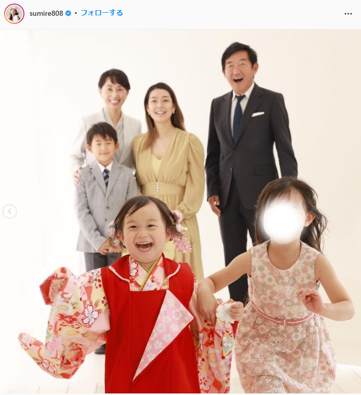 タレントの石田純一(67)の娘でモデルのすみれ(31)が、2021年11月18日、自身のInstagramを更新。父親の石田純一、義母の東尾理子(46)、異母弟妹、東尾修(71)と義母で、七五三の写真を撮影したことを明かし、その写真を公開しました。