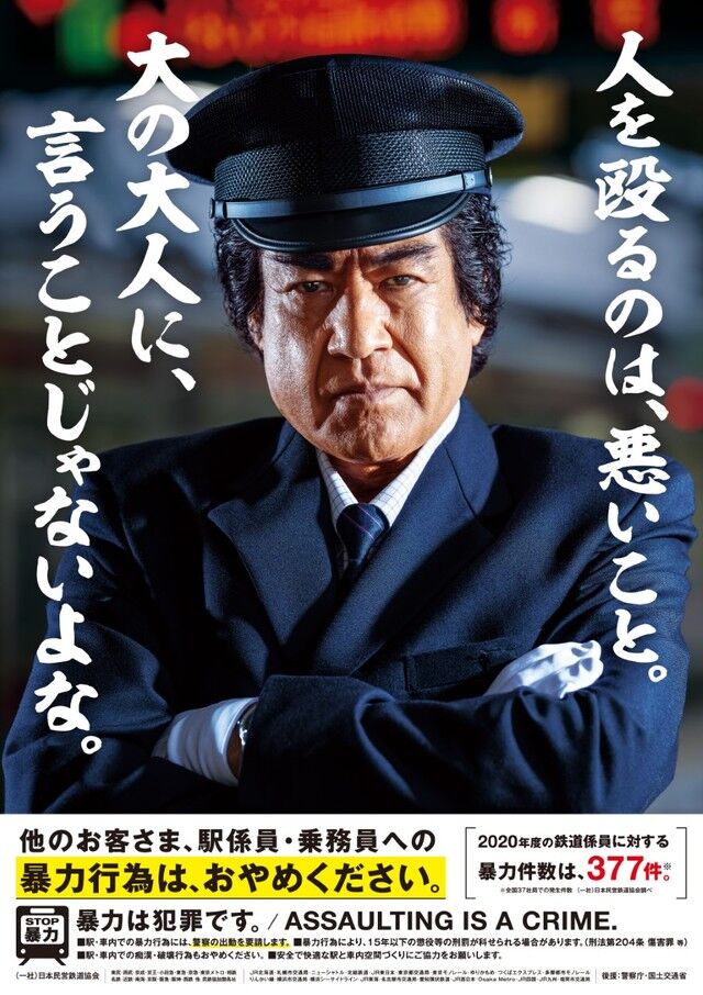 駅員に扮した俳優・藤岡弘、さんが険しい表情で訴えかける――。今年、全国の駅構内に掲示された鉄道係員らへの暴力行為防止を目的としたポスターだ。迫力ある表情とメッセージがひと目をさらう。ツイッター上でも「圧が凄い」と評判のようだ。