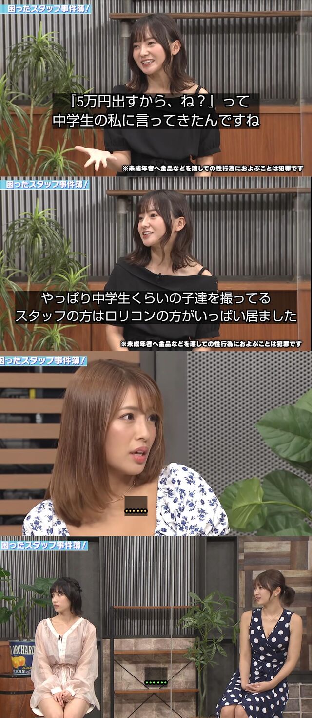 「私は中学生時代からジュニアアイドルでグラビアの撮影をしていたが5万円で売●を持ちかけられていた」と告白