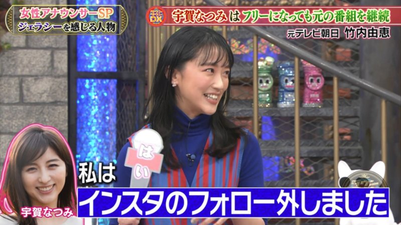 また、事務所に所属せずに完全にフリーでいることも「頭がいいな」と羨ましく思う理由のひとつだそうだが、宇賀の1年後に自分がフリーになったこともあり竹内にとって宇賀は「気になる存在」だという。だが「これを言うとほんとに器が小さいと思われるかもしれないけど」と前置きした竹内は、「密かに彼女はインスタフォローしてくれてるけど、私はインスタのフォローを外しました」とぶっちゃけた。