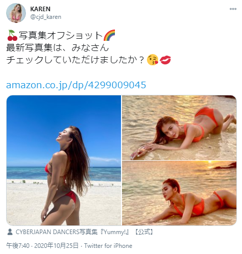 ダンサー&モデルグループ「CYBERJAPAN DANCERS」のメンバー・KAREN(24)が、2020年10月25日、自身のTwitterを更新。発売中のグループの写真集「Yummy!」のオフショット写真を投稿したところ、筋肉ムキムキの美ボディに称賛の声が寄せられていました。