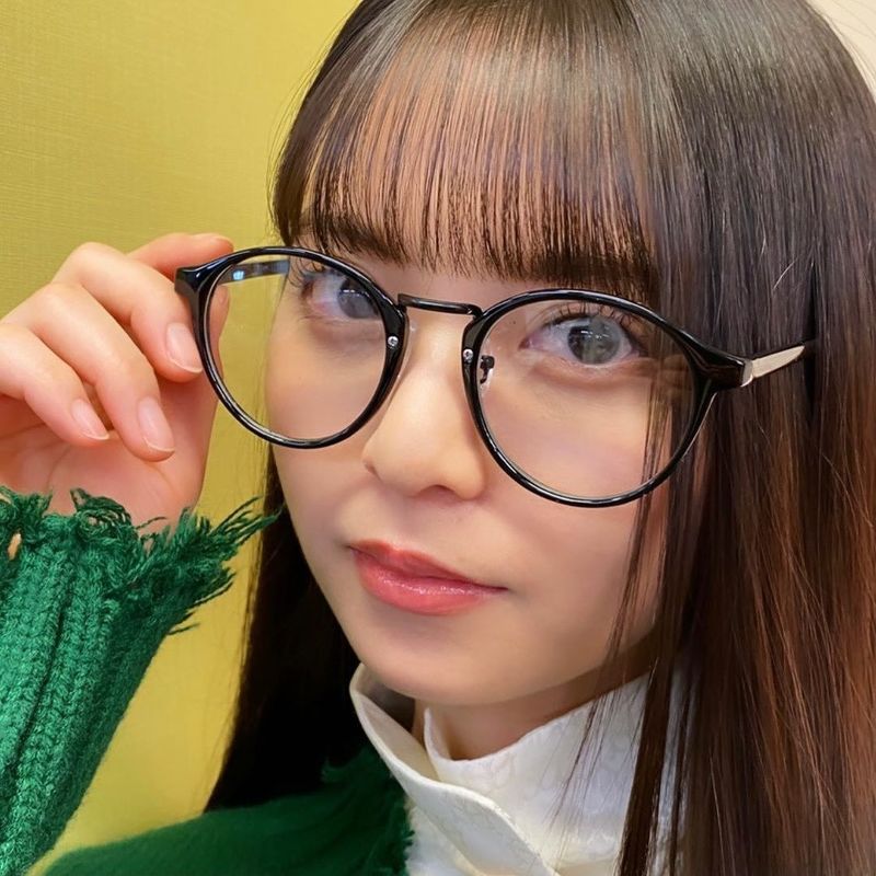 黒縁のメガネをかけたレアなスタイルで、いつもと雰囲気が違って新鮮。大きなメガネのため、小顔がさらに小さく見えて可愛い。メガネに手を添えて知的なポーズをしているのに、可愛さの方が勝ってしまっている。