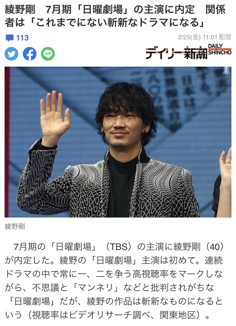 7月期の「日曜劇場」(TBS)の主演に綾野剛(40)が内定した。綾野の「日曜劇場」主演は初めて。連続ドラマの中で常に一、二を争う高視聴率をマークしながら、不思議と「マンネリ」などと批判されがちな「日曜劇場」だが、綾野の作品は斬新なものになるという(視聴率はビデオリサーチ調べ、関東地区)。