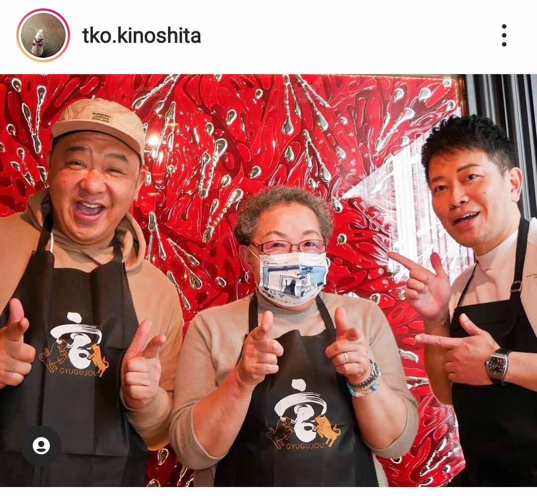 お笑いコンビ「TKO」の木下隆行が3日までに自身のSNSを更新。元「雨上がり決死隊」のタレント・宮迫博之がプロデュースし、1日にオープンした焼肉店「牛宮城」を母・定子さんと訪れたことを報告し、食事の様子を公開した。
