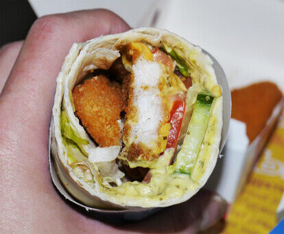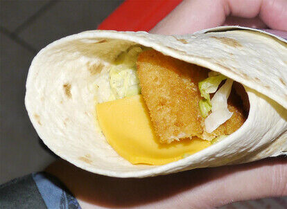 ロシアといえば魚介! と思っていたので、フィッシュラップも食べました。フィレオフィッシュ的な白身魚フライをラップで包んだもので、きゅうり、トマト、レタス、チーズなどがギッシリと生地に巻かれています。