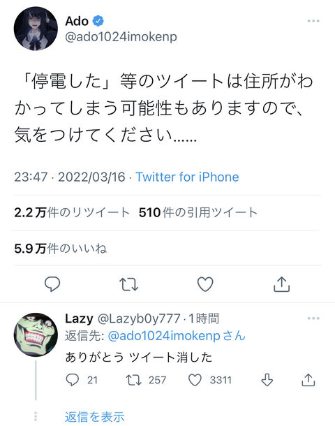 【朗報】Ado「停電ツイートは住所が分かってしまう可能性もあるので注意してください…」 2022/3/23 芸能人の気になる噂 1: 風吹けば名無し 2022/03/17(木) 01:32:20.23 ID:l4bYF1eI0 常識人すぎる 続きを読む Source: 芸能人の気になる噂