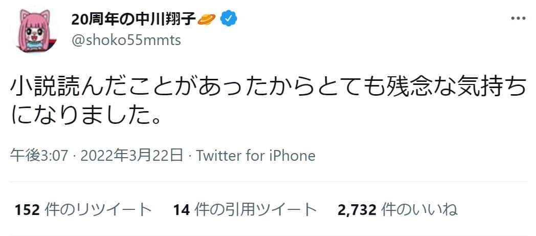 中川さんは同日午後「小説読んだことがあったからとても残念な気持ちになりました」「なにをやってもいろいろ言われるものだから前向きにやっていかないとね」とツイッターに投稿した。