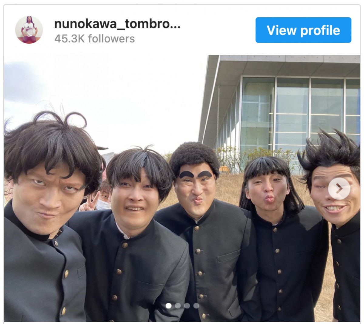 布川が「ハイスクール奇面組です」と投稿したのは『有吉の壁』のオフショット。この日放送された『有吉の壁』は、実際の大学のキャンパスをロケ地にした「イケメンだらけのキャンパス選手権」という企画。この中で、お笑いコンビ・きつねとかが屋、トムブラウンの布川の5人が『ハイスクール!奇面組』のキャラクター・奇面組を演じていた。