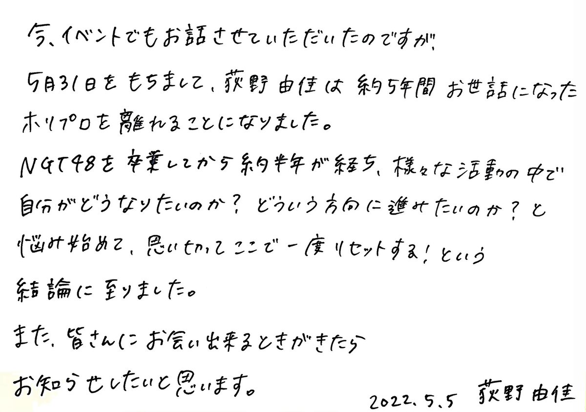 自身のツイッターで直筆メッセージを投稿し、「今、イベントでもお話させていただいたのですが、5月31日をもちまして、荻野由佳は約5年間お世話になったホリプロを離れることになりました」と報告。