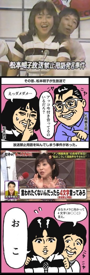 「4文字事件」とは1984年、松本がテレビとラジオの同時生放送中、放送禁止用語を叫んだ一件だ。当時、共演していた片岡鶴太郎から「松本の好きな人の名前、俺知っているんだよ、バラしちゃおうかな」と番組中に言われたそうで、「そんな恋愛事情を言われたら困るなって思いながら。そしたら(笑福亭)鶴光師匠が『4文字を叫べば(鶴太郎が)許してくれるんじゃない?言ったら売れるかもしれない』って乗せられちゃって」と状況を説明した。