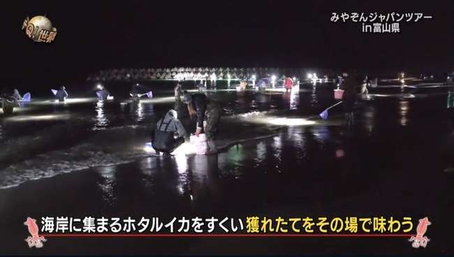 番組は、タレントのみやぞんさんが富山県内の海岸でホタルイカの身投げを見に行くという内容。「海岸に集まるホタルイカをすくい獲れたてをその場で味わう」というテロップに加え、同様のナレーションが流れた。収録中はホタルイカが捕れず、番組内で食べるシーンはなかった。
