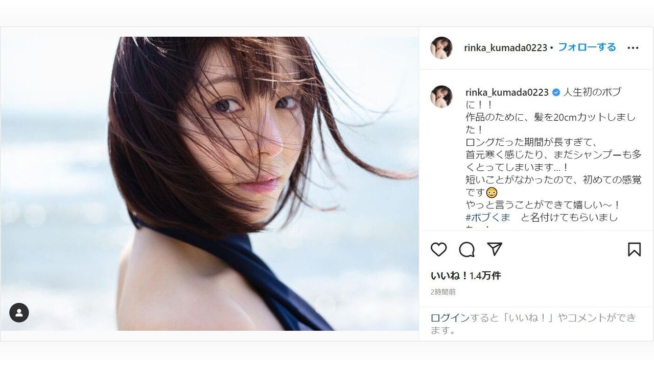 モデル・女優の久間田琳加が9日、長年ロングヘアーだった髪を20cm以上ばっさりカットしたことをInstagramで報告した。