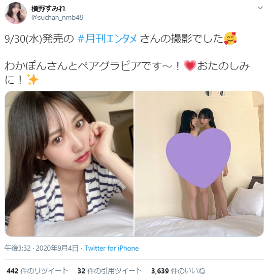 NMB48横野すみれ(19)が、2020年9月30日発売の雑誌『月刊エンタメ』で、8月のグラビアデビューで人気急上昇中のNMB48安部若菜(19)とペアグラビアを披露することがわかりました。発売に先駆け、横野すみれがTwitterでオフショット写真を投稿したところ、ファンからは「隠し方がエロい」と話題になっていました。