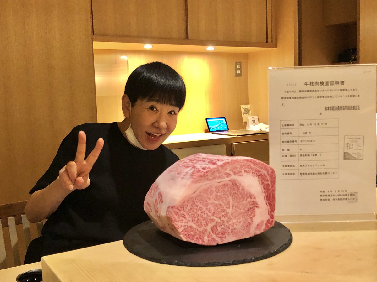 また「昨日は前乗りして姪っ子のやってる肉割烹行ってきました 本当に美味しかった」とし、自身の顔よりはるかに大きな牛肉の塊の隣でピースする姿を披露。「牛枝肉検査証明書」もフレームにおさめ、高級な熊本県産の黒毛和牛だとアピールした。