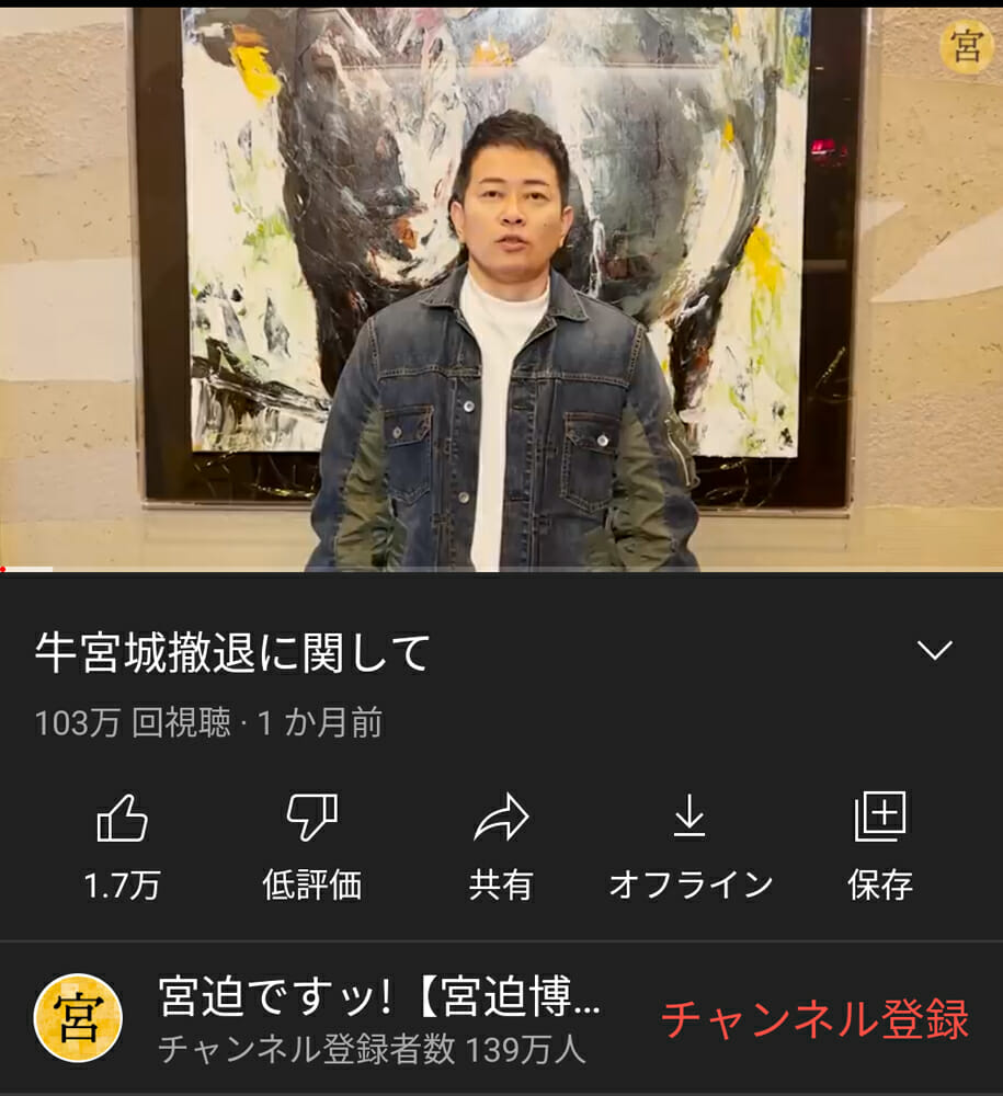 元お笑いコンビ「雨上がり決死隊」の宮迫博之(52)が27日、自身のYouTubeチャンネルを更新。
