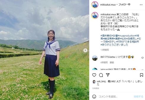 酒井は「第二の故郷『松本』だから出来てしまうこんなコト。。あたたかい目でご覧いただければとおもいます(笑)」と照れながらコメントした。フォロワーは「メッチャ懐かしい!!自然と主題歌が聴こえてドラマ思い出します」「その川沿いを通る度に、七倉園子を探してしまっていたのですが、まさか!本当にいらしていたとは」「出来ればポニーテールにして欲しかったです」とドラマを思い出しながら熱くコメント。