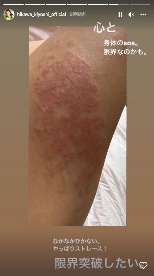 氷川さんは27日にも再びストーリーズで発疹の写真を公開し、「心と身体のSOS。限界なのかも」とつづり、発疹について「なかなかひかない。やっぱストレース!」とコメント。さらに「限界突破したい」と、自身の楽曲「限界突破×サバイバー」にかけてつづっていた。