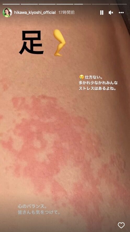 氷川さんはこの日ストーリーズに、赤い発疹が出た自身の足の写真を公開。「仕方ない。多かれ少なかれみんなストレスはあるよね」と、ストレスによるものだと明かし、「心のバランス。皆さんも気をつけて」と呼びかけた。