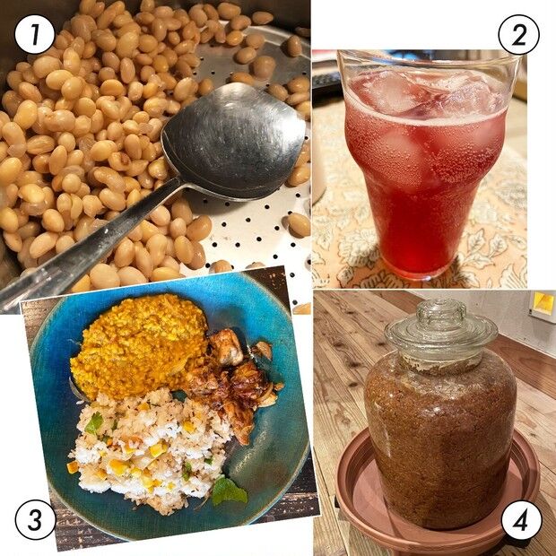 ①実家には発酵機があり、大豆を発酵させて自家製納豆を作っている。②庭で育てたシソで作ったジュース。③カレーはクミンやカルダモンなど複数のスパイスを調合させて。④調味料も自家製。味噌玉づくりに大活躍のお味噌。