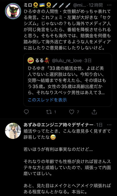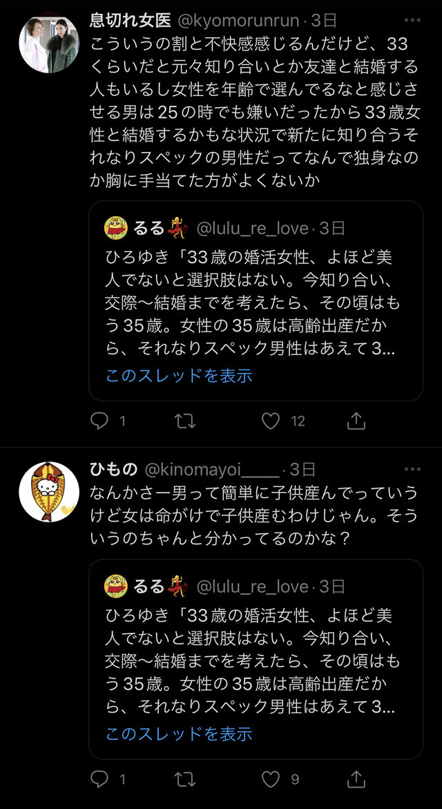 ひろゆき「33歳の婚活女性、よほど美人でないと選択肢はない。今知り合い、交際~結婚までを考えたら、その頃はもう35歳。女性の35歳は高齢出産だから、それなりスペック男性はあえて33歳を選ばない。条件を変えるか結婚を諦めるか。選んでくれる人から選んでください。」