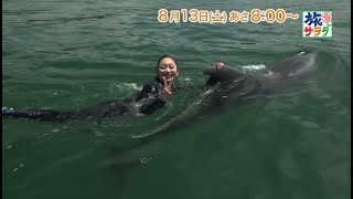 将来はイルカの調教師になりたいという三船は、ロケ前からテンションMAX。海を仕切ったプールで、イルカの背びれを両手で抱きかかえて一緒に泳ぎ、「気持ちいいー!イルカになった気分~」と大興奮となる。「(イルカが)様子を見ながら、いける?いける?みたいな感じで…」とイルカが三船を気にしながら泳いでくれたという。