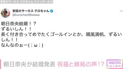 一方、お笑いトリオ・安田大サーカスのクロちゃん(45)は、自身のTwitterで「朝日奈央 結婚!?ずるいしん!!長く付き合ってめでたくゴールインとか、順風満帆、ずるいしん!!なんなのぉー」と、泣き顔の絵文字を付けて、嫉妬している様子をつづった。