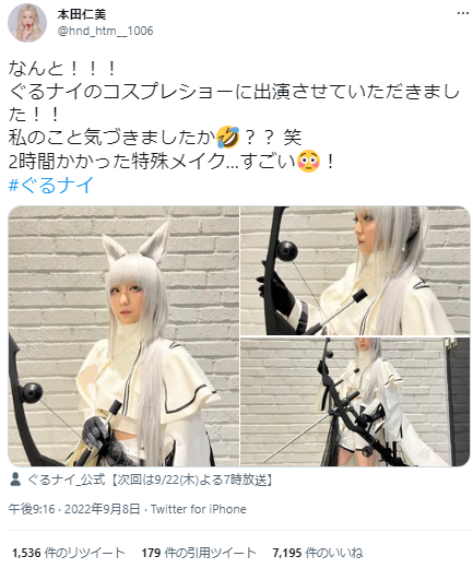 HKT48の人気メンバー・本田仁美(20)が、2022年9月8日放送の日本テレビ系「ぐるぐるナインティナイン」の企画「ダレダレ?コスプレショー」に出演。スマホRPG「アークナイツ」のキャラクター・プラチナに扮したコスプレを披露し、反響を呼んでいました。