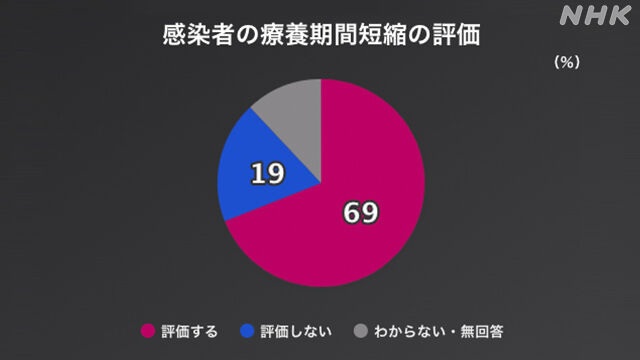 また感染者の自宅などでの療養期間を短縮したことについて、「評価する」が69%、「評価しない」が19%でした。