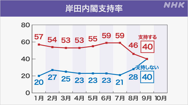 岸田内閣を「支持する」と答えた人は、先月の調査より6ポイント下がって40%だったのに対し、「支持しない」と答えた人は12ポイント上がって40%でした。