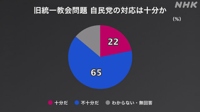 自民党は、今後、旧統一教会や関連団体と一切関係を持たないことを基本方針とし、党所属の国会議員との関係を点検して公表しましたが、自民党の対応は十分だと思うか尋ねたところ、「十分だ」が22%、「不十分だ」が65%でした。