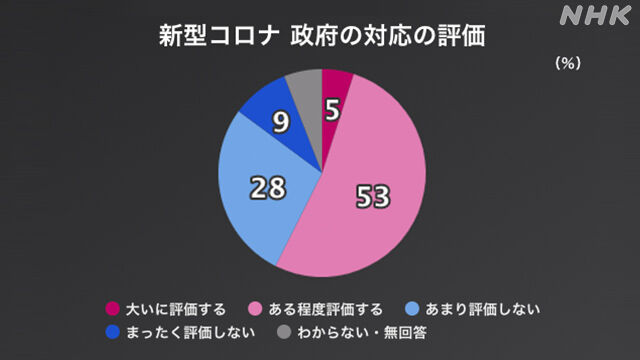 新型コロナウイルスをめぐる政府のこれまでの対応について、「大いに評価する」が5%、「ある程度評価する」が53%、「あまり評価しない」が28%、「まったく評価しない」が9%でした。
