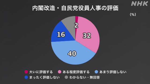 岸田総理大臣が先月行った内閣改造と自民党の役員人事を評価するか尋ねたところ、「大いに評価する」が2%、「ある程度評価する」が32%、「あまり評価しない」が40%、「まったく評価しない」が16%でした。